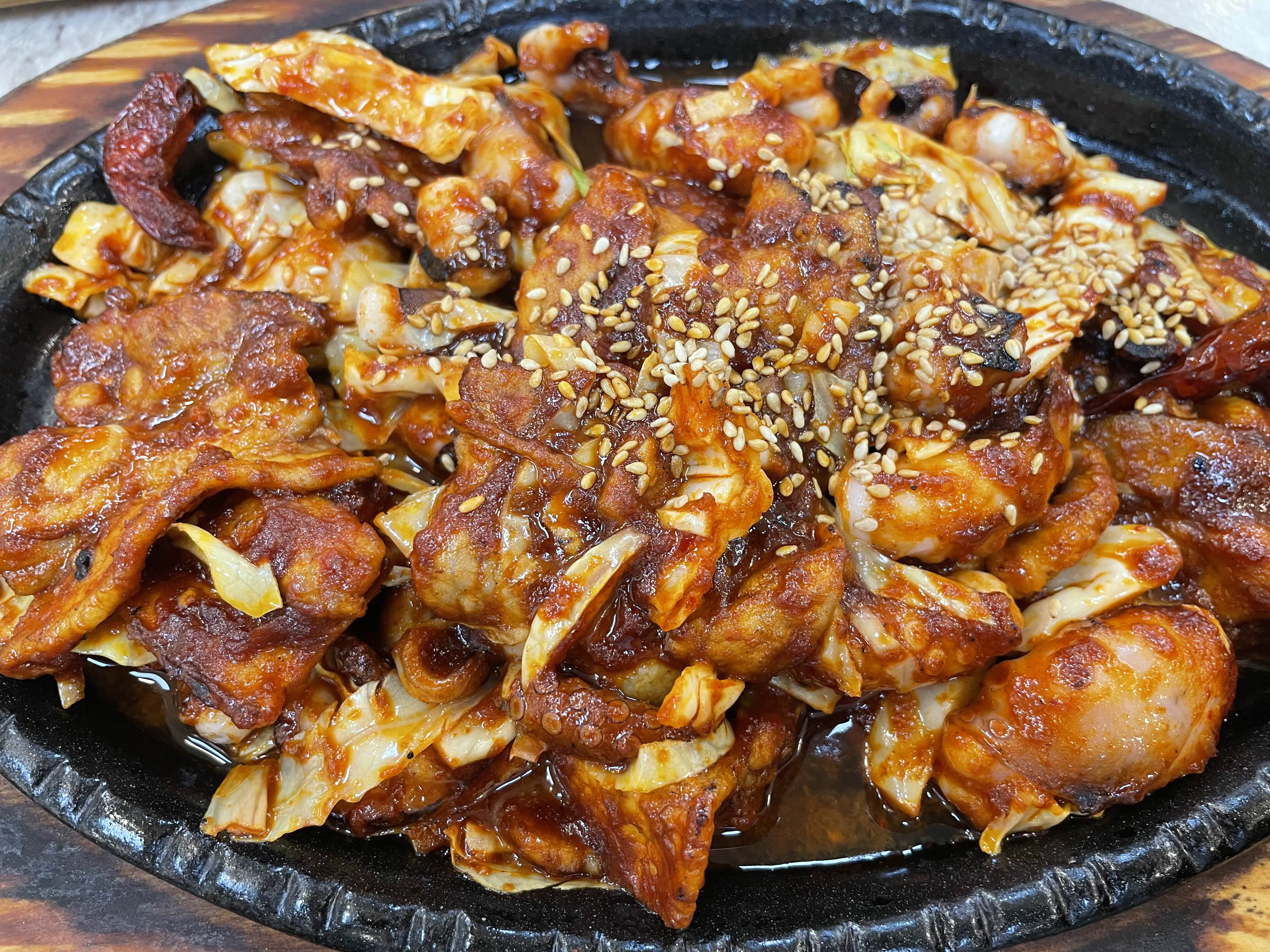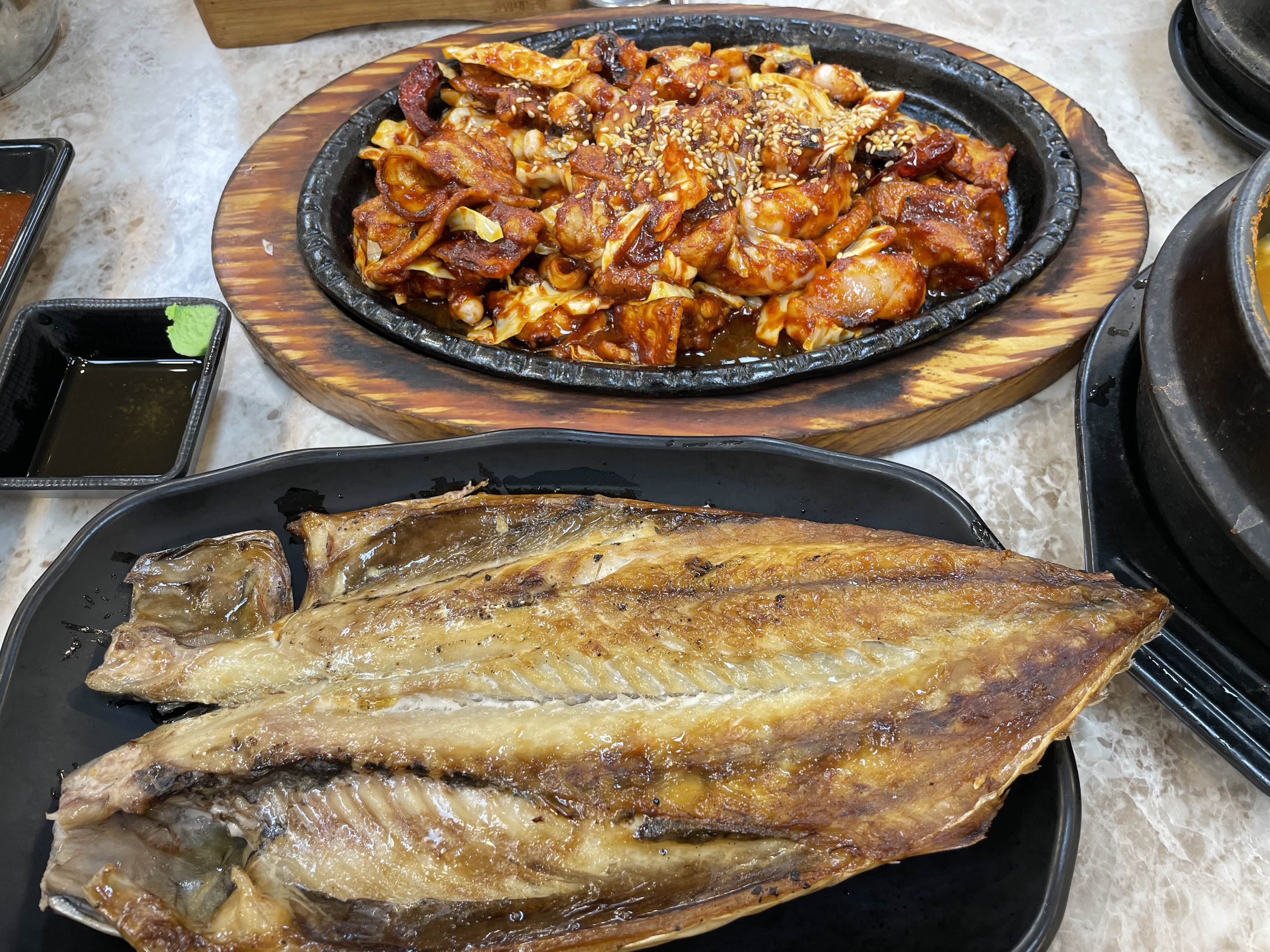 너무 맛있게 빨간 매운 낙지삼겹살과 고등어구이입니다