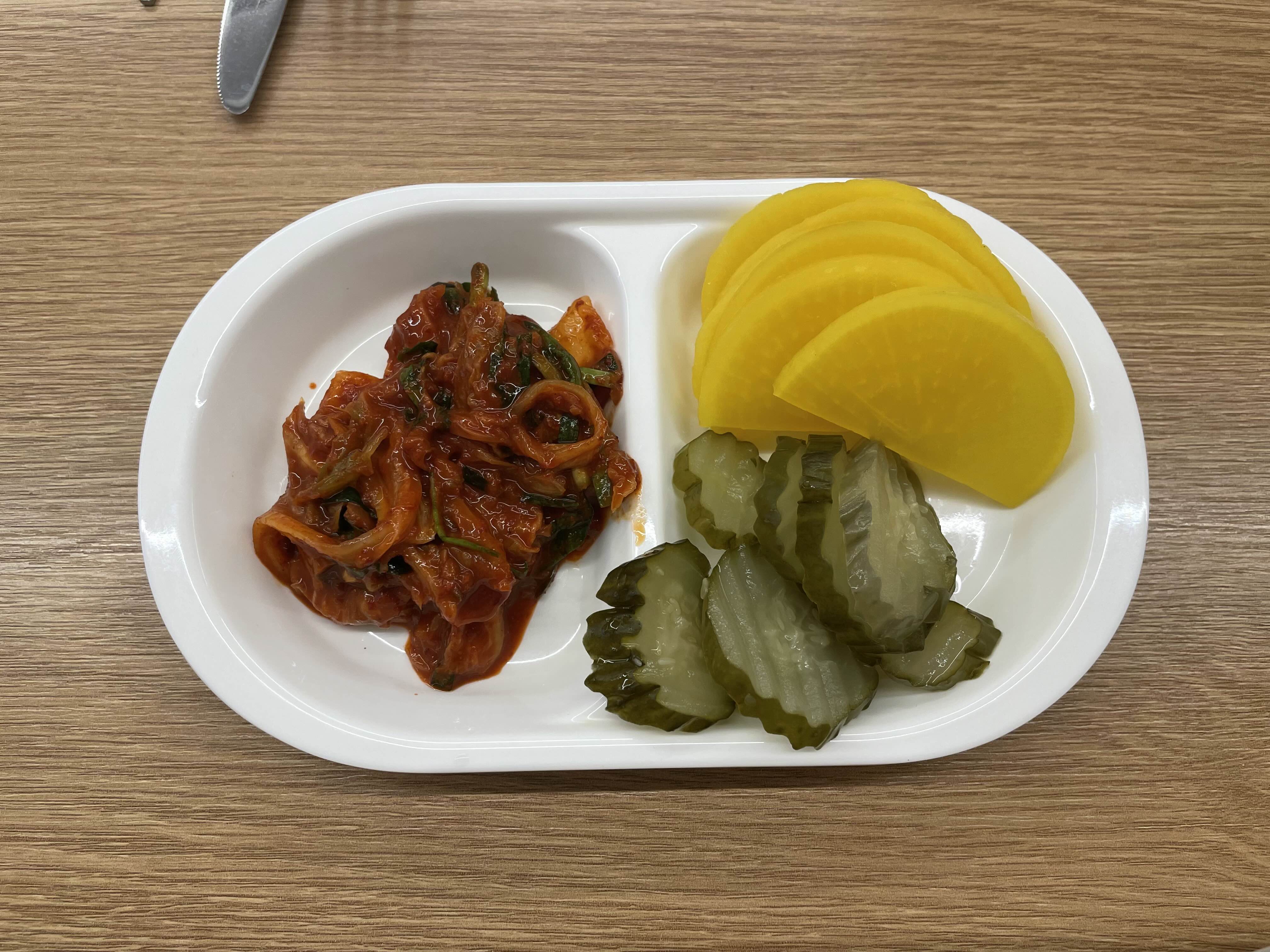 밑반찬은 김치, 단무지, 피클입니다
