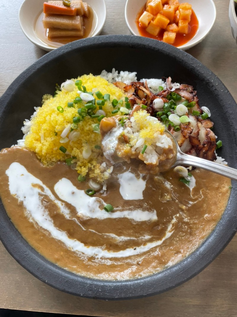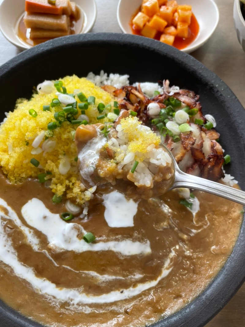 돌문어 커리는 신선한 제주산 돌문어와 톡톡 터지는 날치알이 어우러지는 모닥식탁 대표 커리이며 24시간 숙성시킨 달콤한 소스에 삶은 병아리콩이 부드러운 식감을 더하는 커리이다