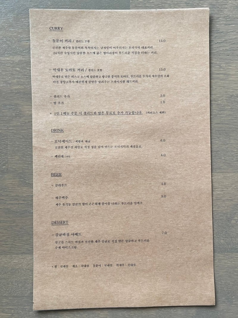 나는 돌문어 카레, 감귤 바질 샤베트 를 주문했다