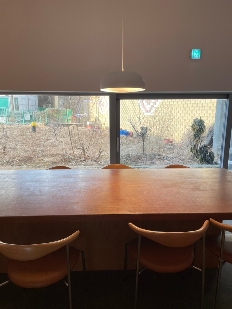 나무 테이블이 엄청 길게 쭉~ 이어져 있다 오히려