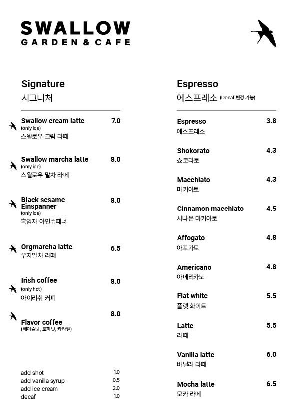 나는 시그니처 메뉴인 스왈로우 크림 라테, 아이스 아메리카노,