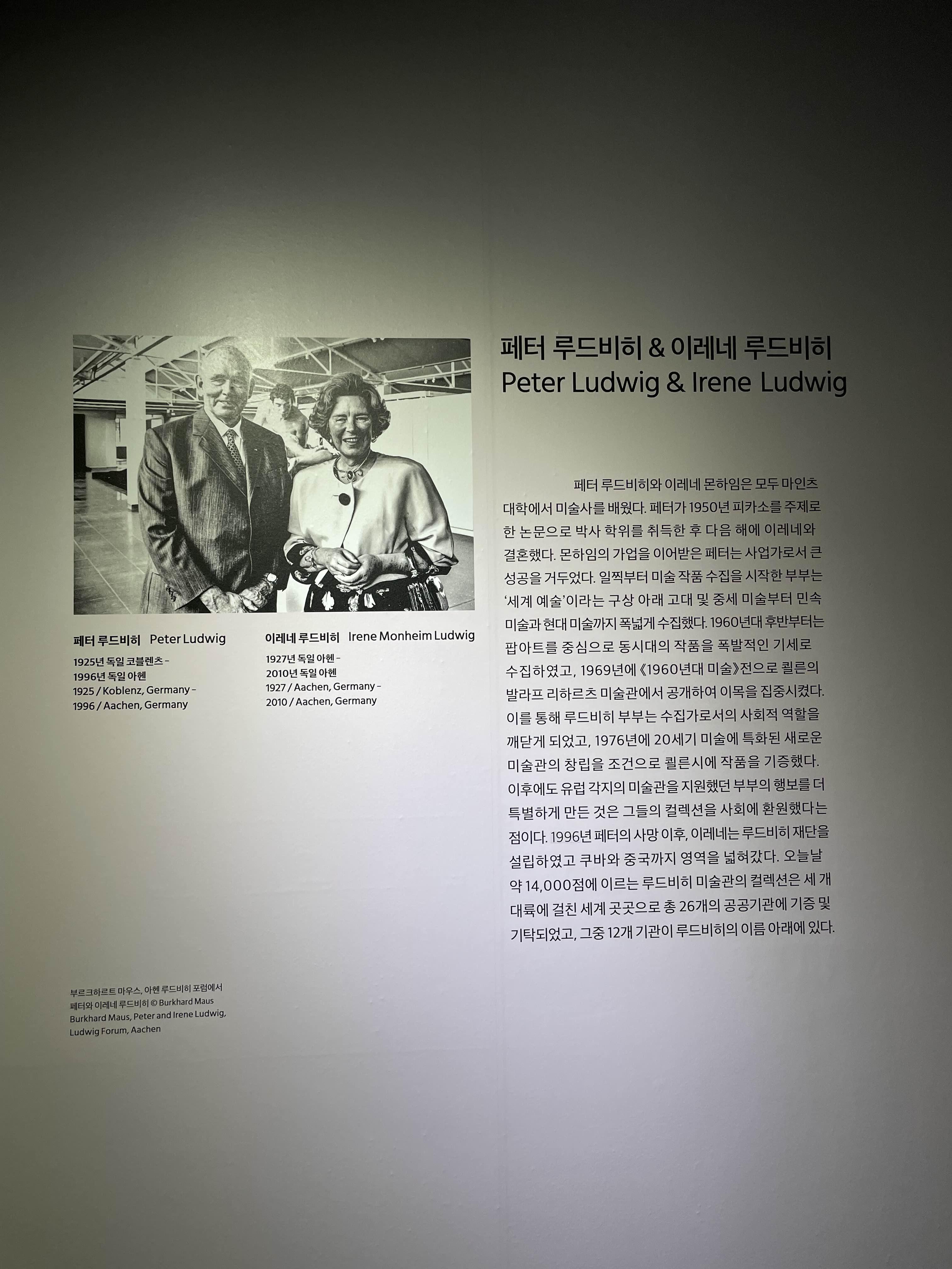 페터 루드비히와 이레네 루드비히는 모두 피카소의 작품과 인연이 있다.패터 루드비히는 1950년 피카소를 주제로 박사 논문을 썼으며, 이레네 루드비히는 1955년 퀼른에서 열린 피카소의 회고전에서 처음으로 그의 작품을 마주하게 된다.피카소는 당대에 입체파라는 혁신적인 예술적 접근을 처음으로 보여준 그 시대를 상징하는 인물이었는데,루드비히 커플이 회고전에서 마주하게 된 그의 작품은 바로 <아티초크를 든 여인>이었다.이 작품에 매료된 후,피카소가 연구한 모든 표현법과 장르의 작품에 주목하였는데,다소 확립되지 않은 화풍처럼 보였어도 피카소만의 자유롭고 신선한 표현에 매료되어 수집하였다.루드비히 부부는 1944년 90점의 피카소 작품을 루드비히 미술관에 기증했으며,2001년에는 774점의 피카소 작품을 세계에서 세 번째로 가장 많이 보유하게 되었다.